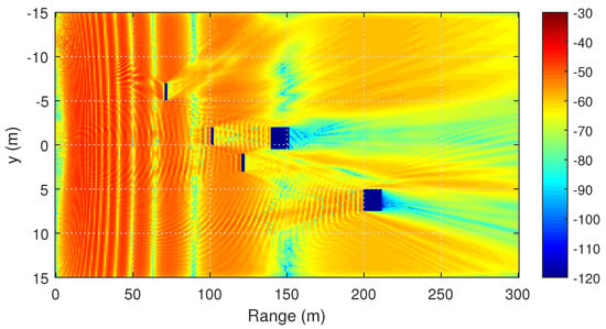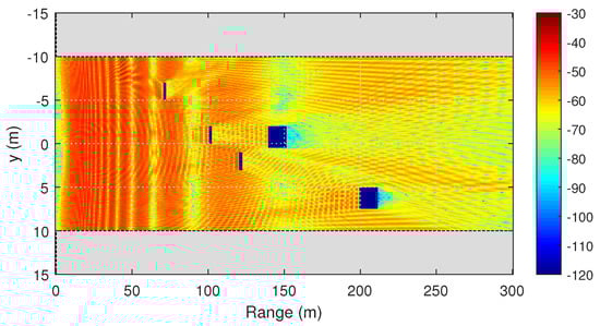 At the same time, buses contribute to field attenuation of 20 dBm at the height of 1.5 m directly behind them. One can see from Figure 14, that reflections from buildings in a street canyon stimulate to significantly compensate for the shadow zone behind a massive road obstacles. In free space without buildings, the field level behind the obstacle remains 10–20 dBm lower.