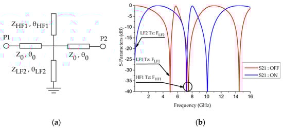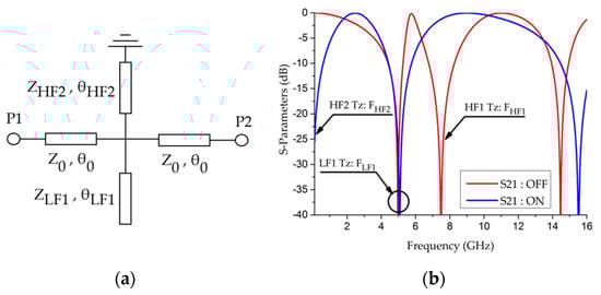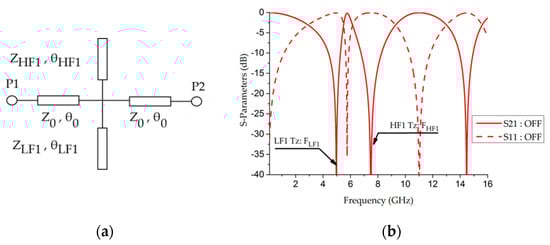 (a) Dual behavior resonator (DBR) design in the OFF state with two open-ended stubs linked to the two frequencies LF1 and HF1; (b) example of simulated results with the two transmission zeroes for a central frequency of 5.6 GHz.