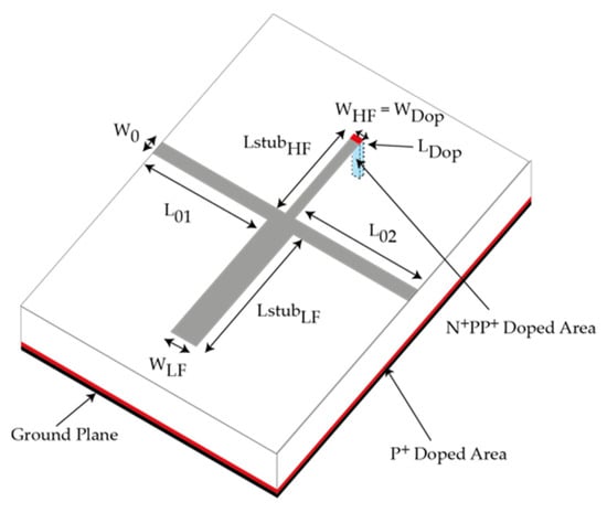 A P-type silicon substrate was chosen with a 675 µm thickness and doped with boron with a resistivity of 2500 Ω·cm. The active element was an N+PP+ junction with a surface doping of around 3 × 1019 atoms/cm3 for the two N+ and P+ regions and doping depths of around 3 µm. Figure 4 shows the switchable DBR design with its integrated active element, located at the end of the HF resonator. The length × width dimensions of the low- and high-frequency stubs are noted LstubHF × WHF and LstubLF × WLF, respectively, and the dimensions of the doped area are noted LDOP × WDOP. The lengths and widths of the two resonators were calculated to obtain a low-frequency transmission zero at 4.8 GHz and a high-frequency transmission zero at 7.2 GHz, based on the synthesis in []. The access line widths were dimensioned to have a 50 Ω characteristic impedance and their lengths were chosen to be sufficiently long to be easily measured. The DBR dimensions are listed in Table 1.