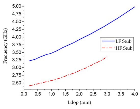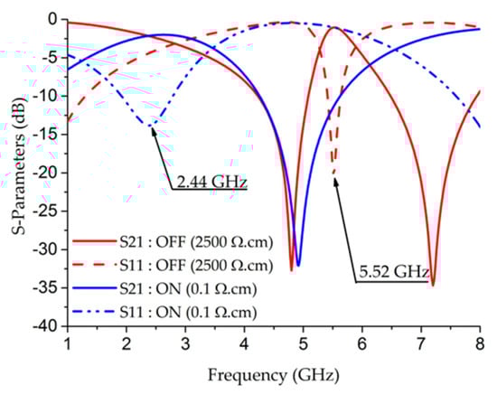 Moreover, with a 5.52 GHz filter in the OFF state, the central frequency in the ON state can be selected between 2.44 GHz and 5 GHz by choosing the length of the doped area and short-circuiting the LF- or HF- stub (Figure 13). The ratio can be between 1:1.1 and 1:2.25, which offers many possibilities depending on the application. The greater the doped area surface, the lower the bias voltage. Thus, if the bias voltage is not an issue, the size can be minimized while maintaining the switched frequency. This can be a good solution in the case of multiple states, such as in [].