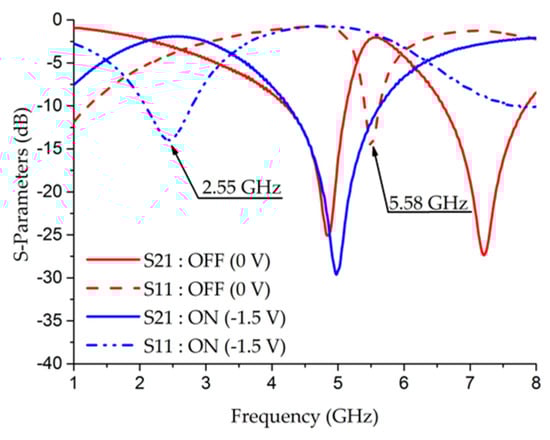The measured results are presented in Figure 7. In the OFF state, with a zero-bias voltage, the two transmission zeroes are measured at 4.83 GHz and 7.2 GHz, which implies a central frequency at 5.58 GHz with an insertion loss level of 1.97 dB. In the ON state, the lowest frequency transmission zero stays relatively constant, whereas the high-frequency transmission zero is moved to the DC frequency so the central frequency is switched to 2.55 GHz with a bias voltage of −1.5 V. The insertion loss level is then 1.9 dB.