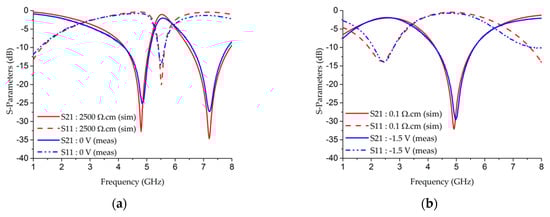 Figure 10a,b show comparisons of the simulated and measured results of switchable DBR2 in the OFF and ON states. As for DBR1, a good agreement was obtained overall. It has a longer ScDDA than DBR1 on the HF stub, with 1 mm length. Therefore, compared with DBR1, the central frequency is the same in the OFF state, i.e., equal to 5.53 GHz, with a 0 V bias voltage. The insertion loss level is 1.97 dB. In the ON state, with a −1.2 V bias voltage, the highest transmission zero is moved to DC and the transmission frequency band is at 2.6 GHz, with an insertion loss level of 1.95 dB. The bias voltage is lower than for DBR1 because the doped area is longer.