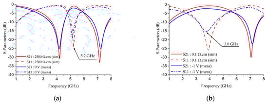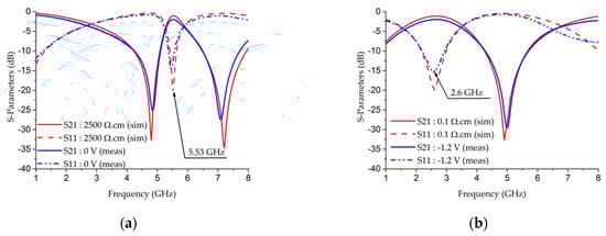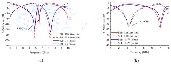 Switchable DBR3 has an ScDDA with a doped length of 0.2 mm, located at the end of the LF resonator. Figure 11a,b show comparisons of the simulated and measured results of switchable DBR3 in the OFF and ON states. These figures show a commutation in the central frequency from 5.53 GHz in the OFF state, with a 0 V bias voltage, to 3.23 GHz in the ON state, with a −1.5 V bias voltage. The insertion loss levels are 1.98 dB and 1.68 dB, respectively.