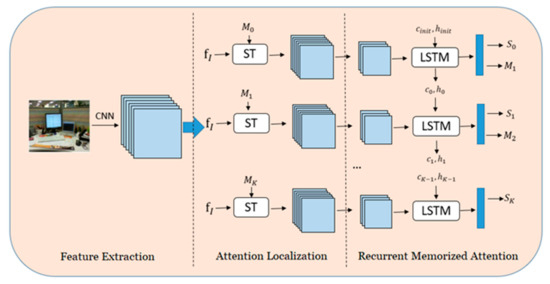 In recent years, an attention model [30,31,32] has been greatly successful in the field of Natural Language Processing (NLP). The success of the attention model in the field of NLP has also promoted its development in some computer vision-related tasks, especially in the direction of fine-grained image classification. Research methods [33,34,35] have gradually evolved from the previous supervised methods to the current weakly supervised method that only employs the category label information of the image to perform fine-grained classification on the image. The attention model automatically pays attention to information of different objects in fine-grained images, such as a bird’s beak and wings, and then extracts features for classification. Inspired by this, we propose a Recurrent Memorized Attention Network (RMAN) model for scene recognition, which simulates the cognitive process in human cognition in which our eyes scan the objects in the scene, while our brain recurrently memorizes them and makes judgment.
