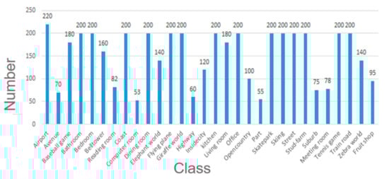 MIT Indoor 67: Unlike the Scene 30 dataset, the MIT Indoor 67 dataset contains only indoor scene images, and the scene dataset mainly covers five major categories, namely “shopping mall”, “family”, “public place”, “leisure place” and “office area”, which can be further subdivided into 67 Small scene categories, such as “Bedroom”, “Bakery”, “Church”, “Bar”, and so on. The dataset has a total of 15,620 scene pictures, and each scene category has a different number of images, but each category contains at least 100 images, and all are in JPG format. Compared with the outdoor scenes, the intra-class similarity for indoor scenes is high, so classification for indoor scenes is more difficult. MIT Indoor 67 has become the most commonly used public dataset for indoor scenes in the field of scene recognition. According to the experimental configuration protocol described by Antonio Torralba [3], which samples n positive examples and 3n negative examples for training one versus another classifier for the d category, we use 80 images in each class as the training set and the remaining images as the test set, ensuring that there are more than 20 testing samples in each class.