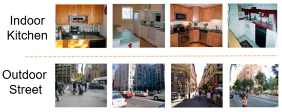 - Quattoni, A.; Torralba, A. Recognizing indoor scenes. In Proceedings of the IEEE Conference on Computer Vision and Pattern Recognition, Miami, FL, USA, 20–25 June 2009; pp. 413–420. [Google Scholar]