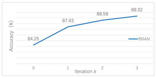 In order to verify whether the classification performance of the RMAN model benefits from recurrently discovering and memorizing the essential scene objects, we compare the accuracy of scene classification of the RMAN model after each iteration. Figure 7 shows the accuracy of scene classification corresponding to different iterations. As can be seen from the figure, in the initial iteration of the network—that is, the global feature of the image is not localized and initialized, the accuracy of scene recognition is 84.25%. After attention localization, LSTM remembers the global features and essential object features, and the classification accuracy rate increases from 84.25% to 87.43%. In the next two iterations, the accuracy increases by 1.16% and 0.73%, respectively. It can be clearly seen from the figure that after the image is recurrently processed by the RMAN model, the classification performance continues to improve. It is probably because with each iteration, the RMAN model employs the LSTM network to memorize the essential scene objects located by the attention mechanism, and each iteration combines the global image features and essential scene object features. However, as the number of iterations increases, the number of essential scene objects that can be found in the entire image may decrease, which will result in the classification accuracy being gradually saturated.