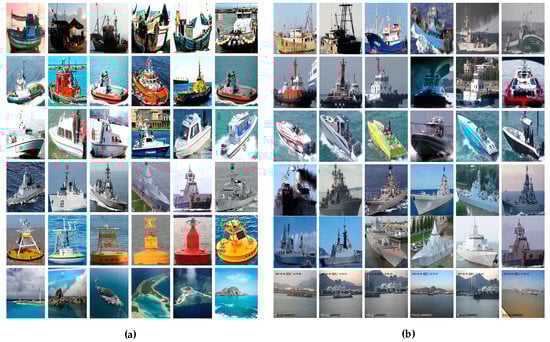 In the past two decades, various algorithm for surface target recognition have been proposed. These methods can be roughly divided into moment-based [2], knowledge-based [3], model-based [4], and neural network-based [5,6]. However, these methods are mainly aimed at fixed scenes, static targets, and require a large amount of labeled data, which are difficult to implement in water scenes. Therefore, previous methods do not perform well in water scenes. In addition, changing the distance and view-points results in variations in the targets’ size and posture, which brings huge challenges for surface target recognition. It can be summarized that the differences in intra-class are large and those in inter-class are small. Some visually similar subcategories cannot even be recognized by untrained-personnel. With the development of deep learning, convolutional neural networks (CNNs) are widely used to detect and classify objects. However, the CNN model is more prone to overfitting because of complicated and similar appearance of surface targets. Moreover, a majority of existing methods used in detection and recognition are based on remote sensing images [7] rather than visible light images. With this regard, there are a few works aimed at visible light images of surface targets. Therefore, there is no complete and large-scale dataset that limits the improvement of networks’ learning ability.