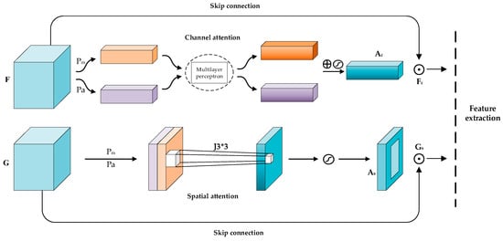 In Equation (3), and are the maximum pooling and average pooling functions, respectively. represents the summation operation of corresponding elements, and means the convolution operation using a convolution kernel of size. is the Sigmod activation function, and is the spatial attention map, . In Equation (4), indicates the dot product operation of the corresponding element, while is the attention feature map after fusion, .