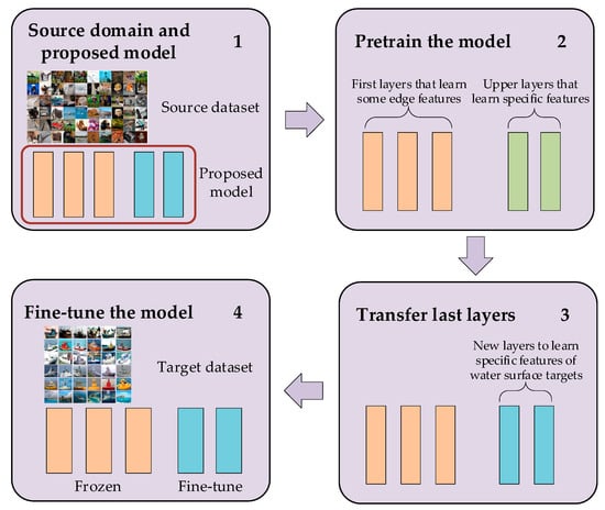Training of deep learning networks requires large datasets. The amount and quality of data directly affect the generalization function and robustness of the learned model. In particular, when the training sample is insufficient, the generalization function of the model is poor, but it is expensive to collect a sufficient amount of high-quality data for surface targets. Transfer learning allows us to handle data-constrained scenarios by using the data labels of other related tasks or domains that already exist. This method stems from the fact that people could obtain useful knowledge from familiar source domains when faced with unfamiliar target tasks. In the task of surface target recognition, a large amount of effective data cannot be obtained because of the high cost of collection and labeling. Direct training with limited data may result in severe overfitting or failure to converge. Therefore, this article introduces transfer learning to combine the general features learned under public datasets with specific features of surface targets under a self-built small sample dataset as Figure 6. First, the model is pretrained on a large-scale public dataset (we choose ImageNet here). Thereafter, part of the parameters is transferred into our self-built small dataset for tuning.