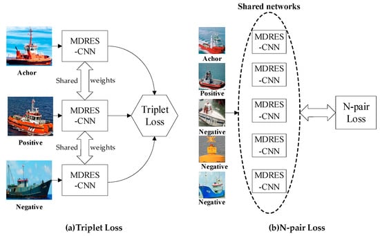 The diagram of different loss functions: (a) triplet loss; (b) N-pair loss.