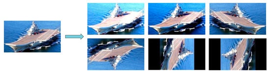 In order to improve the generalization ability and robustness of the model, data enhancement methods are used, including rotation, mirroring, contrast enhancement, brightness enhancement, random cropping, and other methods. The data enhancement methodology could be divided into online enhancement and offline enhancement. Online enhancement refers to the use of algorithms to enhance the original data randomly during the training process. This method does not need to change the local dataset and can directly use the GPU for calculation. Offline enhancement is used to save the enhanced data directly, which needs to enlarge the size of the dataset. The combination of the two methods can achieve more possibilities. The number of images after rotation (different angles), mirroring, contrast enhancement, and brightness enhancement is approximately six times that of the original training set, and about 1/6 of them are selected as the verification set to train the parameters of the model. After offline enhancement, the total number of our self-built dataset reached 3246, of which the number of frigates reaches 594, and the number of reefs is the least and there are 270. The number of other types of targets is between 350 and 420. Figure 8 shows an example of data enhancement for the training set (the image in the example comes from our self-built dataset).