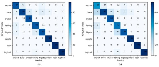 For those that are easier to identify, like rocks and tugboats, there is no difference between the above two models, which can be obtained in Figure 10. However, when identifying aircrafts and fishing boats, our proposed model performs much better than MAMC. Six out of 100 aircraft carriers are misidentified as buoys, and 6 aircrafts are misidentified as fishing boat in our model, while 24 out of 100 aircraft carriers are misidentified as buoys, and 12 aircrafts are misidentified as fishing boat in MAMC. The recognition error is due to the small number of trained samples of the aircraft carrier and the visual similarity between the aircraft carrier and the buoy. The experimental results show that our model is not only stable for general object recognition, but also better for objects with small visual differences than commonly used fine-grained classification algorithm.