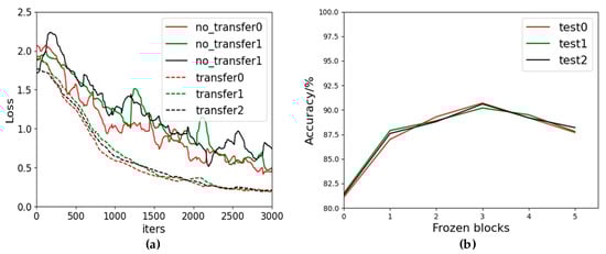 Changes of loss and accuracy in transfer learning: (a) Comparison of the loss of using transfer learning and no transfer learning in three sub-tests; (b) comparison of the accuracy of freezing different convolutional blocks in three sub-tests.
