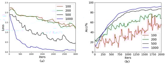 From figures in the above, under different data scales, the loss and accuracy in the training process differ. In Figure 12a, the loss becomes smaller, and the convergence becomes faster with the increase of the data size. In the case of a training set of 1000, loss basically reaches stability when iterations are 1500, while the remaining three curves are still falling, fluctuating, and do not converge. When the training set size is 100 and 200, the difference in loss is not very large. In Figure 12b, as the size of the training set increases, the accuracy is higher, the number of iterations required for convergence is less, and there are fewer fluctuations. The above changes in loss and accuracy are the average of three sub-tests, and the experimental results are convincing. When the data size is 100 or 200, because the learned features are limited, the proposed model is not stable, which is manifested in the inability to converge and a lot of fluctuations. When the data size reaches 1000 and above, the trained model converges much faster and can reach a higher accuracy. These also reflect the stability of the proposed model in another aspect.