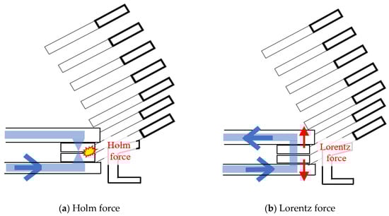 In a typical circuit breaker, when the arc from the contacts reaches the splitter plate, it has a current limit effect that limits the increase in the amount of current introduced by arc voltage. As this effect is an important characteristic that affects the interruption performance of the circuit breaker, many studies are being conducted on the voltage-current characteristics in this area. In a structure with an arc-extinguishment chamber surrounded by molds, such as a wiring circuit breaker, the arc power density increases significantly; in particular, the average current density on the surface of the splitter plate can reach hundreds of A/mm2 [,]. Various studies have been conducted on these arc currents []. In particular, it was found that, the smaller the electrode size of the contacts, the higher the arc voltage [,]. Arc movement during contact separation is also an important factor in analyzing interruption. The reaction force at the contact electrode is proportional to the magnitude of the current, and it is confirmed that it reacts at about ten times the rated current. Therefore, the more the fault current flows into the wiring circuit breaker, the faster the current-time response.