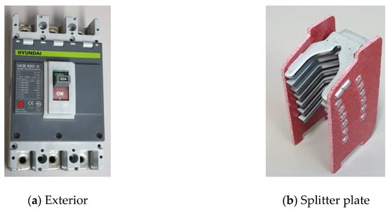 There are various types of circuit breakers installed to protect loads in the event of over-current inflow, depending on capacity and operation. Recently, research on circuit breakers, which are used in a DC power system, has been actively conducted [,,,]. Among them, the circuit breaker frequently used in the distribution system is the mold case circuit breaker (MCCB). The study in this field is mainly focused on the study of the characteristics of voltage current in the circuit breaker and its experimental study [,,,,]. In addition to interruption performance, research is being conducted on the characteristics after interruption [,,,,].