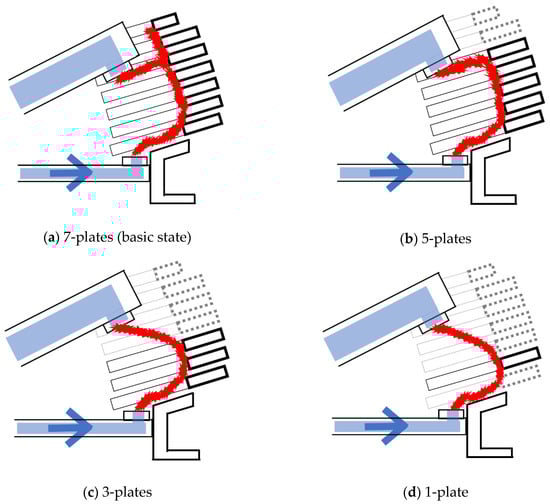 In order to examine the main characteristics of the MCCB, cases were divided and modeled as in Figure 4. Figure 4a is a basic platter plate, consisting of seven plates. In Figure 4b–d, plates are removed at a specific location to change the number of plates and the plates where the arc first touches, in order to verify arc movement, energy consumption at the splitter plate, and so on.