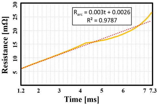 Based on the voltage between the electrodes, the resistance (Rarc) value of section II is obtained. (Figure 7). Section II of this modelling is measured from 1.2 ms to 7.3 ms. The resistance values are fitted as a primary function, and the error rate is 2.13%. This linearized resistance value is used as the resistance (Rarc) in section II in the circuit model.