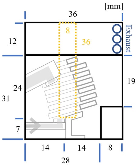 The arc generated by the separation of the contacts grows and expands towards the splitter plate. The forces at this point are hot gas emissions and Lorentz power, as mentioned earlier. The Holm force is a very small value, so it is omitted here. Hot gas produced by arc discharge causes temperature differences, i.e., pressure differences, within the circuit breaker space. The magnitude of the force is obtained through Equations (8) and (9). Modeling is carried out in the interior space of the MCCB to examine the direction of the force generated by arc discharge. Heat from the arc is directed into the upper space where exhausts exist, surrounded by plates. As shown in Figure 8, the hot gas movable virtual space (dotted line) is set, and the generated heat is assumed to move in the center direction of this space. At this time, it is assumed that the moving electrode would move and cause a temperature difference with the ambient, resulting in a force from the moving electrode.