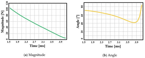 Figure 9 shows the magnitude and angle of the synthetic force of hot gas and Lorentz. At this time, the arm length of the electrode at Lorentz force is 14 mm, and the length r between the electrodes and the angle change between the electrodes are calculated to increase the electrode linearly. At the force of hot gas, the spatial cross section area is 640 mm2 and the ambient temperature is 300 K.