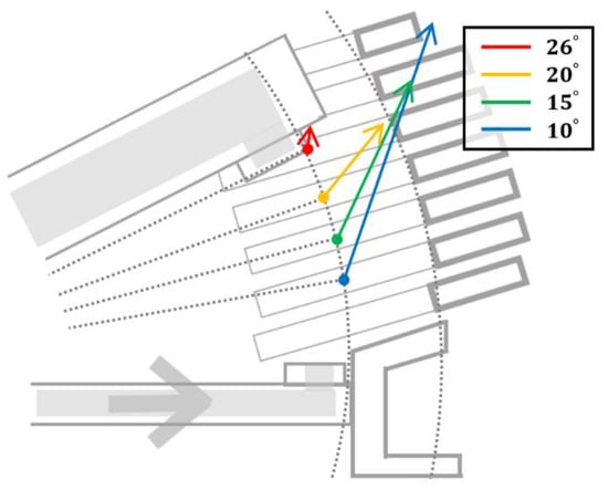 Figure 10 shows the representative values of the previously obtained synthetic forces in the MCCB. In Figure 10, the case of 26° is when the electrode is fully open. If you look at the arc movement, you can see that it is heading towards the top two or three plates rather than the middle of the splitter plates. This simulation is conducted to determine which plate the arc reached first. In [], arc movement when the electrode is opened is studied through experiment and simulation. As with this simulation, it can be seen that the heat by the arc is shifted in the upward direction.