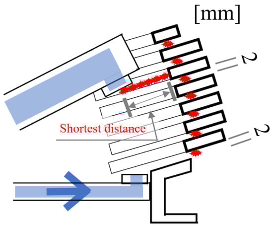 Next is the voltage drop by arc length (Varc). This value is obtained using Equation (6), as shown in the modeling of section II. At this time, the arc length is required, which consists of the shortest distance and a number of distances (2 mm) between plates. For example, in the case of 7-plates (basic state), this is the sum of the shortest distance and seven distances between plates (2 mm) (Figure 11). The shortest distance of cases is as follows: 7-plates is 12 mm, 5-plates is 12 mm, 3-plates is 14 mm, and 1-plate is 19 mm. The constant voltage (Vsp) generated in this section is modeled on the circuit using the zener diode.