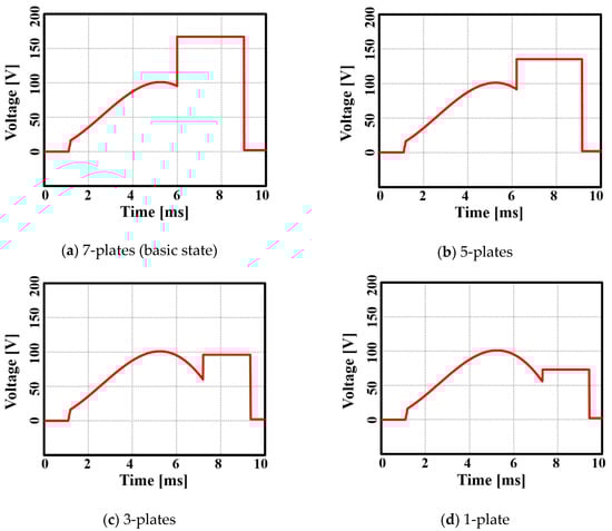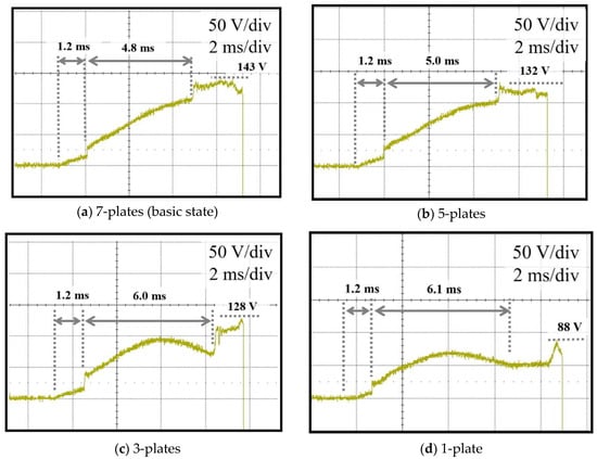 Table 2 below compares the simulated voltage waveform with the experimental voltage waveform. In section II, the mean value of the voltage is calculated, and in section III, the peak value of the voltage is calculated because it is assumed to be a constant voltage. Looking at the results, in section II, 1-plate cases show the largest error rate (36.5%) and, in section III, 3-plates cases show the largest error rate (−25.0%). Overall, the largest error rate is in the case of 1-plate, with the largest number of plates removed compared with the basic state. In the experimental waveform of the 1-plate case (Figure 15d), the beginning of section III shows a constant voltage and then the voltage rises unlike other experimental waves. This is not consistent with the simplified model (Figure 1b) proposed by this paper. In addition, 7-plates to 3-plates can be interpreted as arc movement in the upward moving electrode, but 1-plates do not show that much time difference. It is predicted that this is not moving from top electrode, but from bottom electrode through the arc runner. It is important where the arc first touches the splitter plate moved by the force, that is, the top or bottom electrode.