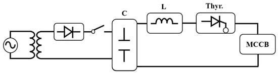To verify the proposed circuit model, we conduct an experiment on the aforementioned cases. Figure 14 shows the experimental setup. The experimental power supplies an overcurrent for the MCCB to operate the interruption. This overcurrent is determined by the capacitor’s charging voltage, capacitance, inductance, and so on. In this paper, the charging voltage is set to 640 V, capacitance is set to 26,700 μF, and inductance is set to 0.258 mH. These values are to allow the incoming over-current frequency to have a value of 60 Hz, with half-wave (8.3 ms) of its entire cycle as the current is zero. The experimental waveforms for cases are presented in Figure 15.