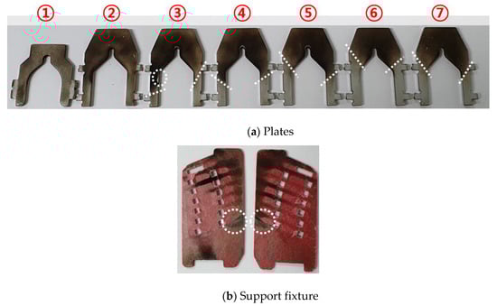 Figure 16 shows the damaged state of plates and supports after several interruption experiments on the splitter plate. The damaged area is marked with white dotted lines. The pictures of the plates show that the second and third plates are the most damaged. This shows that almost all areas of the second plate are charred, and the third plate is slightly dug (white dotted circle). This feature can also be seen in the support fixture in Figure 16b. Most of the damage occurred in the space around the second and third plate above. In addition, this shows that there is a lot of discharge between the seventh (bottom) plate and the arc runner (white dotted circle).