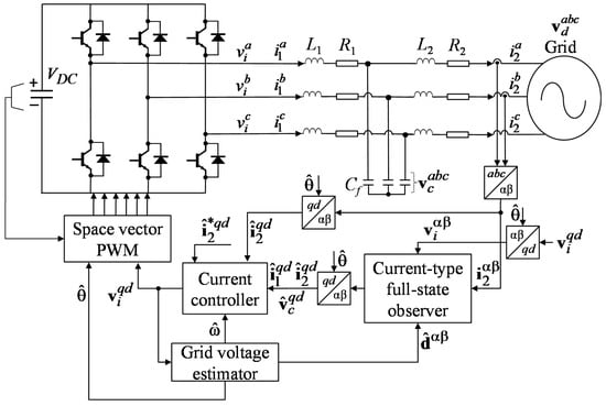 Voltage source inverters (VSIs) are typically used as an interface between the main grid and renewable distributed generation (DG) sources. By regulating the injected grid currents using a proper current control strategy, the maximized active power extracted from the DG can be delivered to the grid. Because the pulse width modulation (PWM) technique with a high switching frequency is commonly adopted for the inverter topologies, inductive (L) or inductive–capacitive–inductive (LCL) filters are a mandatory part in inverter structures to eliminate the switching harmonics injected into the grid. Among them, the LCL filter configuration is preferred because of its superiority of high switching frequency attenuation with a small and compact size in comparison with the L filter giving a similar performance. However, the undamped resonance nature of the LCL filter requires a robust control algorithm to the stabilize system. The damping issue in the LCL-filtered inverter can be solved simply by a passive solution using additional resistors in LCL circuits at the expense of higher power loss []. On the other hand, active damping methods based on the modified control algorithm or additional LCL filter state feedback are preferable [,,,]. In particular, the research works in [,] install additional sensors for the capacitor currents or voltages to accomplish the virtual-resistor-based active damping solution. Alternatively, the full-state feedback control method is studied for an LCL-filtered inverter system in detail in [,] to actively damp the resonance peak. To save the cost of sensing devices for all system states, a full-state observer to estimate the system state variables is used in those works.