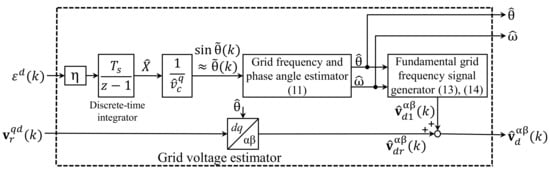 As shown in Figure 2, the estimated grid information including the grid voltages, grid phase angle, and frequency is obtained from the proposed grid voltage estimator, which uses the current controller output as the inputs. The detailed development on the proposed grid voltage estimator is presented in the next section.