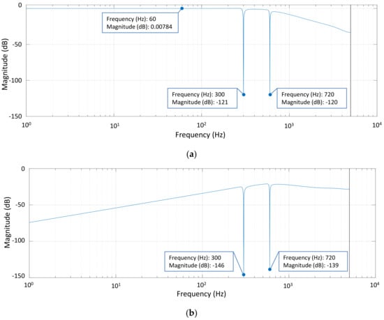 In this subsection, the capabilities of the current controller to track the reference and to reject the disturbances from a distorted grid environment are assessed by the Bode plot of the closed-loop transfer function which relates the output grid current to its reference , and the transfer function from the disturbance to the system output . These two transfer functions are expressed as follows: