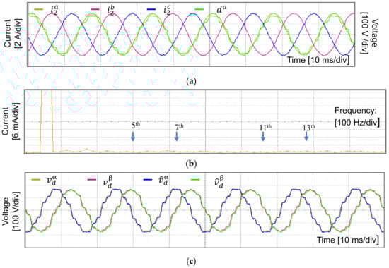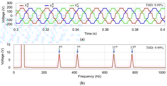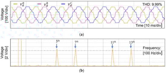 In order to simulate the worst operation condition happening in the main grid, the proposed current control scheme is verified under distorted grid voltages containing the harmonic components in the orders of 5th, 7th, 11th, and 13th with 5% magnitude of the fundamental grid voltage as represented in Figure 6a. The fast Fourier transform (FFT) result of phase-a voltage is also shown in Figure 6b to clearly visualize the magnitude of distorted harmonics, in which the total harmonic distortion (THD) is 9.99%.