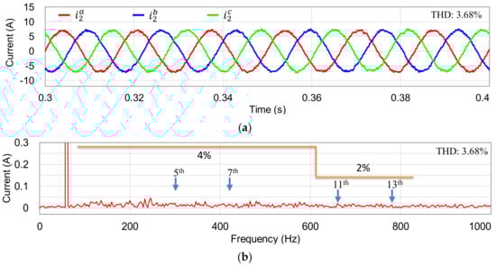 Figure 7 shows the simulation results of three-phase grid-side currents at steady-state under the grid condition in Figure 7a. The current injected into the grid is 7 A. The simulation test clearly shows high-quality grid-side currents even in the presence of a severely distorted grid condition with only the THD value of 3.68%, which is compliant with limits specified by the grid interconnection regulation IEEE Std. 1547 []. The magnitudes of harmonics are presented more evidently in the FFT result of phase-a current as shown in Figure 7b, which illustrates that the current controller well rejects the distorted harmonics from the grid to produce clean output currents.