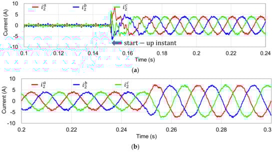 In the grid voltage sensorless current control scheme, the control performance such as current overshoot and transient time should be validated because one of the most severe transient responses occurs during the start-up instance. For this purpose, Figure 8a represents the grid current control performance at start-up instance based on the start-up procedure in Section 3.4. As shown in this figure, the current controller starts to control the injected currents at 0.15 s. With the prior information of the actual grid phase angle obtained by the start-up algorithm, and the best guess of the grid frequency and voltage magnitude, the sensorless control can be started smoothly with minimal current overshoot and transient time. The current responses reach the steady state after about 2 grid voltage cycles. Initial transient current overshoot is observed as 8 A. However, it is damped rapidly and it does not trigger the system halt caused by the protection mechanism. To verify the dynamic performance of the current controller, another transient test result is shown in Figure 8b under a step change in the q-axis current reference from 4 A to 7 A at 0.25 s. It is obviously shown that the currents quickly track the new reference value without overshoot, which validates the stable and desirable transient response of the proposed control scheme.