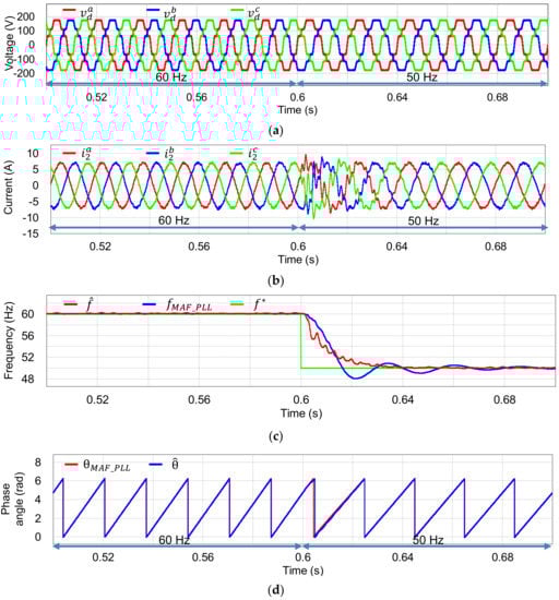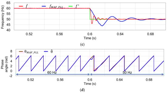 Other transient response of the current controller is tested under the frequency of distorted grid varying from 60 Hz to 50 Hz at 0.6 s as depicted in Figure 9a. Since a sudden change in the grid frequency causes the mismatch between the estimated and actual frequency of the grid, the injected phase currents encounter a transient period lasting 38 ms before reaching the steady state at 50 Hz as illustrated in Figure 9b. Figure 9c shows more visibly the estimating performance of the grid frequency by the proposed voltage sensorless scheme in comparing with the actual one f*, and the output of a moving average filter-based phase locked-loop (MAF-PLL) with the measured grid voltages []. Even under abrupt grid frequency variation of f*, the proposed grid voltage estimator provides a smoother and faster estimated frequency than the MAF-PLL method. Finally, the synchronization behavior of the proposed grid voltage estimation under such an operation condition is validated in view of the estimated grid phase angle. The estimated phase angle is compared to the output of a MAF-PLL in Figure 9d. As expected, the estimated quantity is aligned well with the output of the MAF-PLL and keeps a stable synchronization of the inverter with the main grid even without using the direct grid voltage sensing devices.