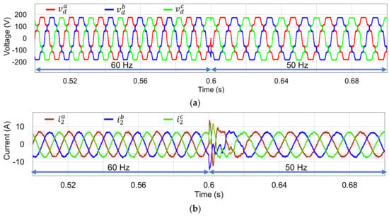 Simulation results of the proposed scheme under grid frequency variation from 60 Hz to 50 Hz at 0.6 s. (a) Three-phase grid voltages; (b) three-phase grid-side currents; (c) estimated frequency by the proposed scheme , the extracted frequency by the moving average filter-based phase locked-loop (MAF-PLL) with measured grid voltages fMAF_PLL, and the actual frequency f*; (d) estimated phase angle by the proposed scheme and the extracted phase angle from the MAF-PLL with measured grid voltages .