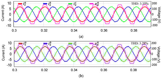 Figure 11 represents the grid current responses under distorted grid and uncertainty in system parameters. In particular, the filter capacitance value increases to 5.5 μF in Figure 11a and decreases to 3.3 μF in Figure 11b. Moreover, to consider the parasitic resistance of the filter capacitor caused by the aging effect of the filter capacitors, the resistances R3 of 2 Ω are added to filter capacitors in series in these simulations. As expected, since the proposed current controller designed by the LQR concept has the robustness under system parameter uncertainties, even in these conditions, the three-phase grid currents are still maintained with good performance of the THD at 3.35% and 3.28%, respectively.