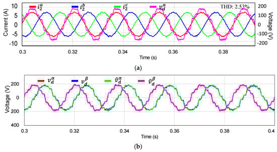 Simulation results for steady-state grid current responses under distorted weak grid voltage with grid inductor Lg of 3 mH. (a) Three-phase grid-side currents; (b) measured and estimated grid voltages in the stationary reference frame.