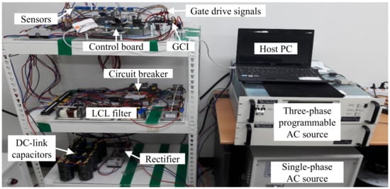 In this section, the feasibility of the proposed grid voltage sensorless control scheme is validated by a lab-based hardware prototype constructing for a three-phase 2 kVA LCL-filtered GCI with the system parameters listed in Table 1. The hardware system configuration and the experimental setup are depicted in Figure 13 and Figure 14, respectively. The overall system was built by a three-phase LCL-filtered inverter controlled by digital signal processor (DSP) TMS320F28335 [], a magnetic contactor for grid-connecting operation, an alternating current (AC) power source (PACIFIC 320-ASX) to emulate three-phase grid voltages, and sensors to measure the currents and voltages. Similar to the simulation setup, the grid voltage sensors were included in the system for comparison purpose only.