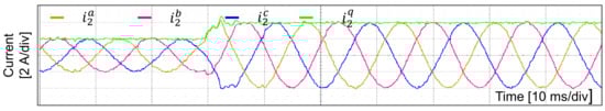 The transient responses of the proposed control scheme are validated by experiments. Figure 17 shows the transient current response of the proposed scheme under the step change in q-axis current reference from 2 A to 4 A, in which the grid-side currents instantly track the new reference without noticeable overshoot. The dynamic performance of the proposed current control shows a good agreement in both the simulation in Figure 8b and the experimental result in Figure 17.
