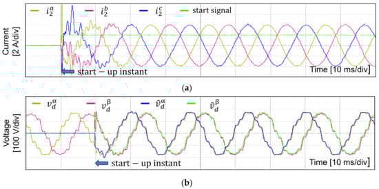 Another test is conducted to verify the start-up procedure of the sensorless control scheme experimentally. As shown in Figure 18a, the sensorless algorithm is successfully started and the grid phase currents reach steady state rapidly within 30 ms. Similar to the start-up response in the simulation result in Figure 8a, the current overshoot is damped fast and the settling time is short. The estimated grid voltages are represented in Figure 18b with the measured quantities in the stationary frame. It is shown clearly that the estimated values track the measured ones well from the initial time. This demonstrates the effectiveness of the start-up process to provide the correct information of the grid phase angle as well as the fast dynamic characteristics of the grid voltage estimator.