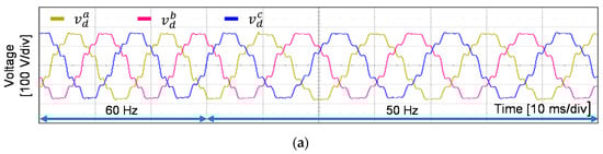 As the final experimental test, the performance of the grid voltage sensorless current controller is validated under both the grid frequency variation and abrupt phase jump condition as shown in Figure 20a, which is exactly the same as the simulation environment in Figure 10a. Remarkably, the grid phase currents and estimated grid frequency reach steady state after only 10 ms in Figure 20b. The grid frequency obtained from the MAF-PLL with the measured grid voltages is also plotted in this figure for the performance comparison. Larger overshoot and longer settling time in the frequency detection by the MAF-PLL may cause a severely degraded transient current response, making it more probable the protection mechanism will be triggered. On the other hand, the proposed current controller effectively handles the grid phase jump condition with fast transient and reduced current overshoot.