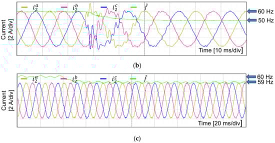 The next transient test is conducted with the condition of the grid frequency variation. Figure 19a shows the distorted grid voltages having the frequency jump from 60 Hz to 50 Hz. When the grid frequency is instantly varied, the grid currents are contaminated by the harmonic distortion during around 2 grid cycles before reaching steady-state at the new grid frequency as shown in Figure 19b. The estimated grid frequency is also presented in this figure to clearly explain that the mistuned frequency in the resonant term of the current controller is responsible for the current harmonic distortion. However, as soon as the estimated grid frequency tracks the actual value well, the grid currents are recovered to sinusoidal waveforms. To validate the accuracy of the estimated grid frequency, Figure 19c shows the experimental test result when the actual frequency varies in a small range of 1 Hz. Even for such a small variation, the grid frequency can be detected well with a reasonable fluctuation of only around 0.3 Hz as clearly shown in Figure 19c, restoring the grid currents to being quite sinusoidal.