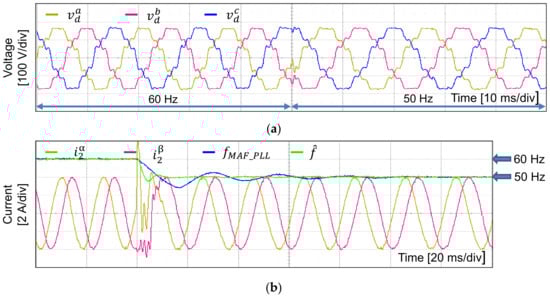 Experimental results of the proposed scheme under grid frequency variation from 60 Hz to 50 Hz and phase jump of −30°. (a) Three-phase grid voltages; (b) stationary grid-side currents, and comparative result of the grid frequency estimations between the proposed control scheme and the MAF-PLL method.