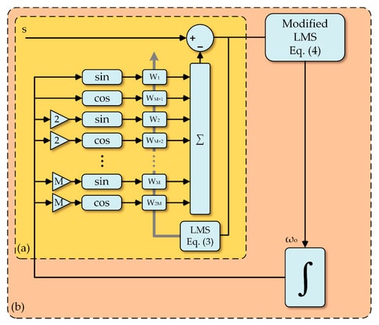 where  is the frequency of the greater magnitude component,  denotes the system deviation and  is the adaptive step for the modified LMS. The FLC and WFLC diagrams are shown in Figure 1.