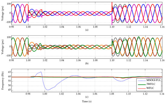In SC2, the power grid suffers an asymmetric voltage sag in phases A and C from 1 pu to 0.2 pu peak-to-peak in 1.0 s, returning to nominal voltage in 1.1 s. Once again, the synchronization time of the algorithms with the original signal and frequency disturbances were observed. Figure 4 presents the voltage results for SDFLC and MSOGI-FLL and frequency results for 3WFLC, WFLC, and MSOGI-FLL.