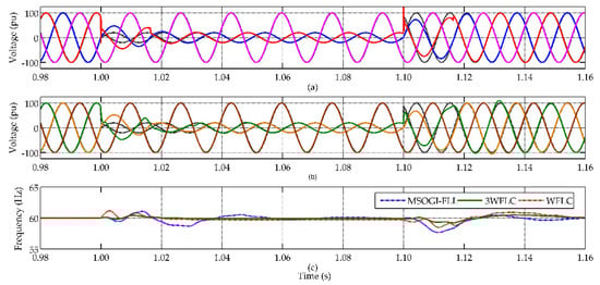 Results from simulation scenario 1, symmetrical voltage drop. (a) Sequence Detector Fourier Linear Combiner (SDFLC)voltage outline in voltage drop; (b) multiple second-order generalized integrators and frequency-locked loop (MSOGI-FLL) voltage outline in voltage drop; (c) Frequency transients during asymmetrical voltage drop.