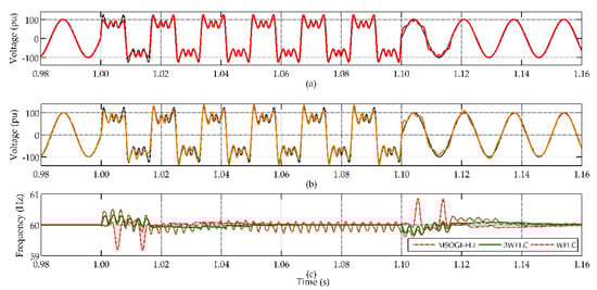 Results from simulation scenario 3, harmonic injection tracking. (a) SDFLC harmonic voltage tracking; (b) MSOGI-FLL voltage tracking. (c) Frequency transients in harmonic injection.